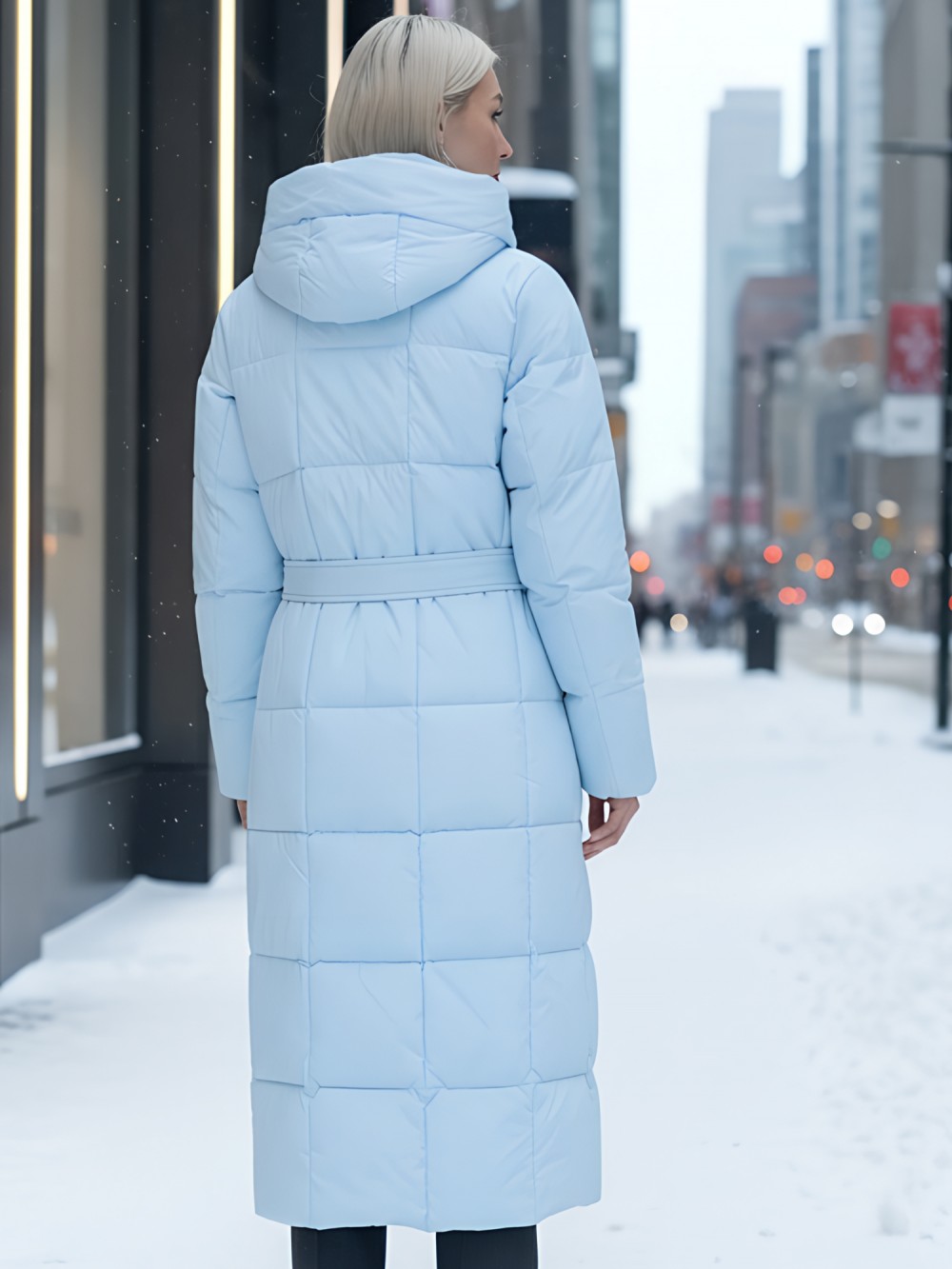 Пояс и шлевки. Пальто утепленное стеганное зимнее с капюшоном женское голубого цвета 9609Gl заказите оптом на mtforce.ru
